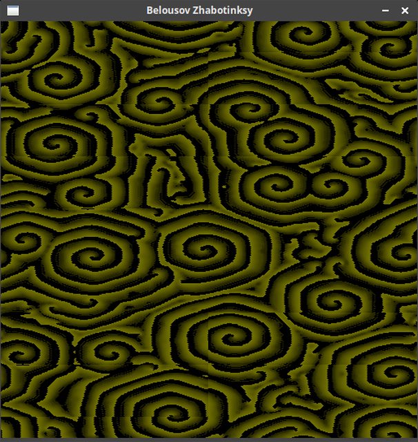 An OpenGL 3.3 implementation of Belousov-Zhabotinsky reaction with a cellular automaton.