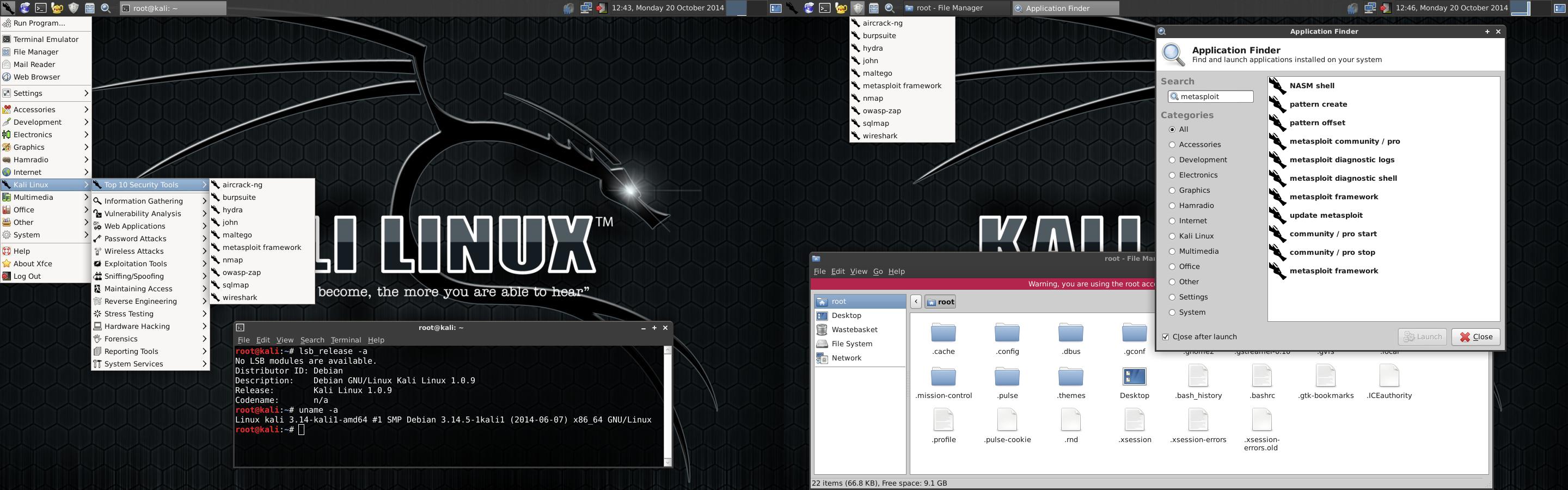 Kali 2.x (Debian 8) Left: tweaked GNOME 3.10, Right: custom XFCE 4.10. Both running conky.