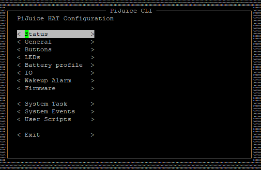 pijuice_clito configure your PiJuice unit. - See PiJuice documentation for more information. My preferred configuration is to set a wakeup timer to start at a preferred time daily, but you can set this as you see fit.