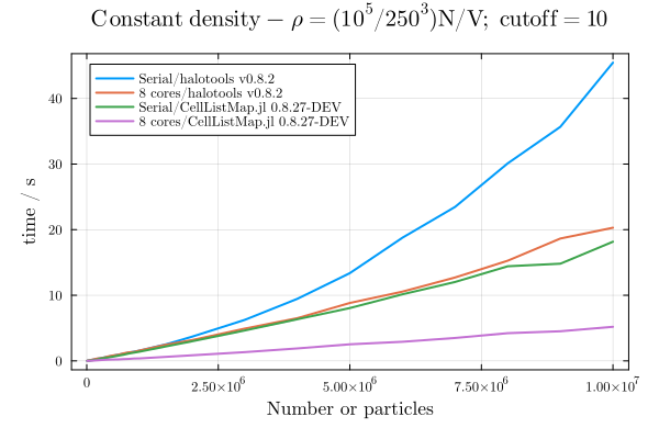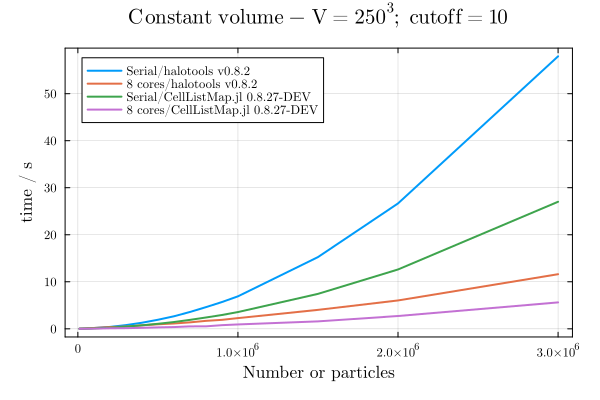 L. Martínez, CellListMap.jl: Efficient and customizable cell list implementation for calculation of pairwise particle properties within a cutoff. Computer Physics Communications, 279, 108452, 2022. https://doi.org/10.1016/j.cpc.2022.108452